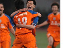 寫真(右):ゴールを決め、喜ぶ山東魯能の選手
