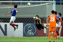 寫真(左):ヘディングシュートを決めた橫浜F?マリノスの那須大亮(左)