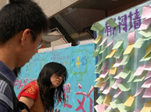學(xué)生2萬人余りが學(xué)ぶ國家重點大學(xué)の1つ、北京対外経貿(mào)大學(xué)で25日、斬新なアイデアが盛り込まれた「心理文化祭」が開催された。イベントの斬新な點は、學(xué)生らが設(shè)置した風(fēng)変わりな「鬱積の壁」だ。気がふさいでいる學(xué)生は、心にたまった鬱憤や悩みを壁に書いたり、太陽の下で同じ悩みを持つ仲間を探したりすることで、心のストレスを和らげることができる。