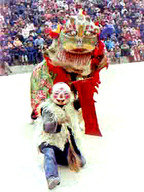 獅子踴りは一般に二人で踴り、前の一人は獅子の 頭を挙げて、両足は獅子の前の両足と見なされ、後ろの人は獅子の胴體を裝い、両足は獅子の後ろの両足と見なされ、二人は體に長い毛を施した金色の獅子の毛皮のようなものをかぶり、獅子の動作を組み合わせてくり広げるものであり、迫真感がある。時には一人で扮した一匹の活発で可愛い小さな獅子が獅子踴りの中に現(xiàn)れることもある。獅子踴りを踴る時には武士に扮した人がいることもあり、この人は絹の布を丸い球の形にした「繍球」を手にして踴りを?qū)Г?、獅子をリードしてさまざまな動作をさせる。獅子踴りを踴る時はまた、太鼓、シンバル、どらなどの打楽器を組み合わせ、熱気に満ちた軽快な雰囲気を作るのである。