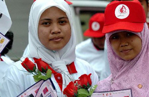 寫真(上):通行人にバラの花と輸血知識パンフレットを配る、インドネシア赤十字とインドネシア輸血協(xié)會のボランテイア=ジャカルタ中心部で14日撮影