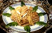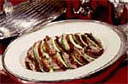 2、 ネギ、ショウガをナベに入れて、スルメイカを巻いたものを入れて少し炒め、味をよく調(diào)節(jié)して薄めのくずあんをかけてお皿に盛り付ければよい。