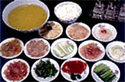 材料 トリのささみ、ブタの胃袋、ブタの腎臓、ライギョの身、水で煮てもどしたスルメイカ、油でもどした魚(yú)の浮き袋、ハム、中國(guó)パセリ、タマネギ、きれいに洗ったトリの塊それぞれ20グラム、水で煮てもどした湯葉、ハクサイの芯、エンドウの若芽、ネギ、もやし、キノコそれぞれ50グラム、米線(太めのビーフン)200グラム。