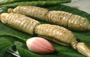 材料 新鮮なレンコン500グラム、紫色のお米100グラム、トリ肉をすりつぶしたもの50グラム、新鮮なハスの葉1枚