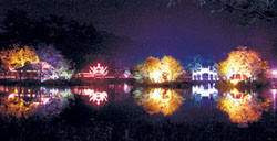 Островок Саньтаньиньюе находится в южной части озера Сиху; на нем высятся три каменные пагоды, имеющие более чем 400-летнюю историю. Высота пагод – примерно два метра. Пагоды, крыши которых имеют форму тыквы-горлянки, смотрятся очень живописно. В стенах пагод есть круглые отверстия и сквозь них в ясные лунные ночи виден свечей, горящих внутри пагод. Их свечение отражается в озерной глади, тронутой дымкой тумана.