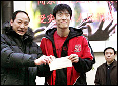 Лю Сян (в центре) и его тренер Сунь Хайпин (слева) передают пожертвования в пользу пострадавших от землетрясения и цунами в Южной и Юго-Восточной Азии