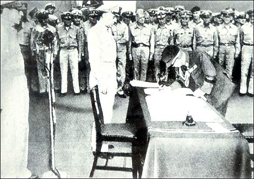 Японский представитель Умедзу подписывает Акт о безоговорочной капитуляции Японии на борту линкора ?Миссури?, Токийская бухта.