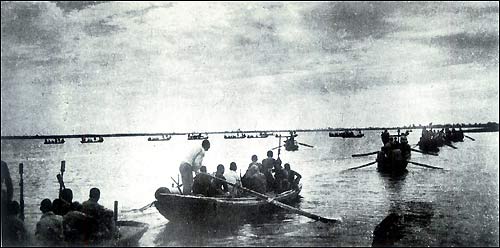 Бойцы Сопротивления бесшумно пересекают озеро Байяндянь, провинция Хэбэй.