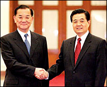 Ху Цзиньтао на встрече с председателем партии Гоминьдан Китая Лянь Чжанем выразил надежду, что усилиями обеих сторон КПК и партия Гоминьдан будут двигаться в направлении "мира, стабильности и развития отношений между двумя берегами Тайваньского пролива".