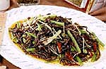 2) Обжарить угря еще раз, добавить соль, немного приготовленного из бобов соуса, соевый соус, рисовое вино, молотый черный перец, нарезанный соломкой жгучий перец, глюконат натрия, мелко нарезанные лук, имбирь и чеснок, обжаренный сельдерей, сбрызнутый уксусом. Выложить блюдо на тарелку, посыпать сверху измельченным душистым горошком и нарезанным соломкой имбирем.