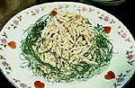 2) Толстые части мяса проткнуть бамбуковой лучиной, отварить цыпленка, вынуть из бульона и остудить.