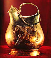 Серебряный чайник найден археологами в 1970 году в деревне Хэцзяцунь в пригороде Сиани. Чайник по форме напоминает кожаный мешок и стремя всадника - кочевника северного Китая, высота - 18,5 см, а диаметр носа 2,3 см. Чайник такой формы удобен и в походе, и в обычных условиях. Это доказывает мастерство техники литья в династию Тан (618-907 гг. н.э.). По бокам - танцующие лощади, их позы грациозны. Изображение дает представление об отношении к этим благородным животным в династию Тан при императоре Сюаньцзуне.