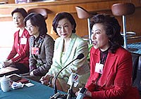 По случаю Международного женского дня в гостинице ?Цзинфэн? состоялась встреча с журналистами. Перед представителями СМИ выступили члены ВК НПКСК Чжэн Минмин (вторая справа), ЛИ Цзяин (первая справа), Чжан Сайе (вторая слева) и Ху Баолинь (первая слева).