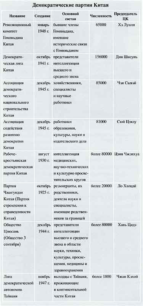К демократическим партиям относятся 8 партий: Революционный комитет Гоминьдана Китая, Демократическая лига Китая, Ассоциация демократического национального строительства Китая, Ассоциация содействия развитию демократии Китая, Рабоче-крестьянская демократическая партия Китая, партия Чжигундан Китая (Партия стремления к справедливости Китая), Общество Цзюсань (общество 3 сентября) и Лига демократической автономии Тайваня. Большинство из них созданы и развивались во время войны Сопротивления японским захватчикам и Освободительной войны. Все они поддерживают политическое руководство со стороны КПК, что является историческим выбором, сделанным ими в ходе долговременного сотрудничества с КПК и совместной борьбы. В рамках Конституции КНР все демократические партия имеют политическую свободу, организационно независимы и юридически равноправны. В сотрудничестве с демократическими партиями КПК придерживается основного курса: ?длительное сосуществование и взаимный контроль, полная искренность по отношению друг к другу, готовность делить славу и позор?.
