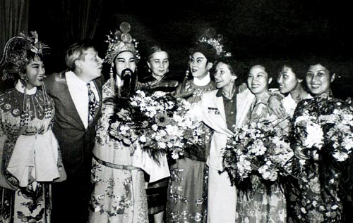 Народные артисты СССР С. В. Образцов и О. В. Лепешина с артистами Шаосинской оперы, находящимися на гастролях в СССР. Москва, 1955 г.