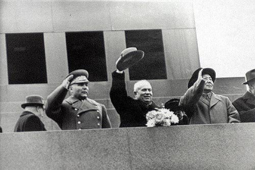Председатель Народного Правительства КНР Мао Дзэдун, Первый секретарь ЦК КПСС Н. С. Хрущев и Р. Малиновский на трибуне Мавзолея.