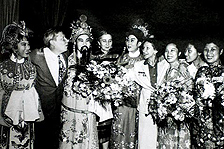 Заслуженный артист РСФСР А.Райкин среди артистов труппы Шанхайского театра музыкальной драмы в Центральном доме работников искусств.