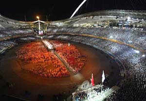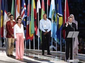 El estadio olímpico apareció decorado con un inmenso campo de trigo formado por más de 45,000 espigas en el que se representaba la comunión del cielo y de la tierra y vivió el desfile de la despedida de los abanderados de los 202 países que participaron en los Juegos.