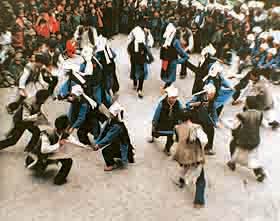 En la danza “Kua′erhuan”, los bailadores se forman en un círculo abierto y la posición de cada bailador en el círculo es muy importante. Empezando por los dos extremos del circulo abierto, hombre y mujer, que forman una pareja enamorada, se ponen frente a frente, de modo que la mitad del círculo son hombres y la otra mitad, mujeres. Después de tomar el vino de cebada, los jóvenes empiezan a bailar en medio de los gritos de los espectadores.