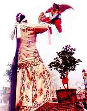 Después llegan otros grupos: el de zancos, cuyos artistas tienen la cara maquillada y visten ropa de ópera; el del cuento popular “l(fā)a pelea entre la garza y el mejillón”, en el cual un artista que hace del ave pica las valvas del molusco interpretado por otro artista; y el del “brasero” sin fuego, adornado con flores y telas de seda y colgado del hombro de un varón. En este grupo los artistas representan las piezas de ópera populares Se inunda la colina Jinshan y Reencuentro de los cónyuges en el puente Caoqiao. Los últimos grupos en venir son el de ni?os de las aldeas, parados sobre las pértigas cargadas por adultos y azotando los tamboriles sujetos al pecho; el de la Danza con tazones de forma de flor de loto, originada del taoísmo, cuyos artistas los tienen con velas encendidas y puestos en la cabeza, los hombros y las manos para actuar como acróbatas; y el de Portadores de pabellones amarrados a los palos altos con esfinges de personajes de vivos gestos. Ahora todos los grupos entran en la plaza grande para presentarse uno por uno de manera formal.