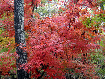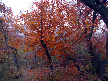 A la brisa fresca, las primeras escarchas del oto?o han vuelto las hojas de los fustetes amarillos tan rojas como los celajes que surcan el firmamento. Una veintena de variedades de árboles de follaje rojo, tales como el arce rojo de Estados Unidos, el fustete rojo de Holanda, el ciruelo y el bruno de follaje violeta, ti?en de rojo y tornan atractivas la monta?a Baiwang, las laderas de monta?a en Hongluosi y las de junto al valle Mutianyu y al lago Jinhai, situadas en los arrabales de Beijing.