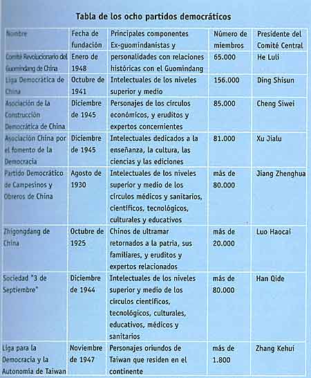Además del Partido Comunista de China, existen en el país ocho partidos políticos con el nombre genérico de "partidos democráticos": el Comité Revolucionario del Guomindang de China, la Liga Democrática de China, la Asociación de la Construcción Democrática de China, la Asociación China para el Fomento de la Democracia, el Partido Democrático de los Campesinos y Obreros de China, el Zhigongdang de China, la Sociedad "3 de Septiembre" y la Liga para la Democracia y la Autonomía de Taiwán. La mayoría de estos partidos nacieron y crecieron durante la Guerra de Resistencia contra el Japón y la Guerra de Liberación Nacional. En lo político, apoyan la dirección del PCCh, siendo ésta una decisión histórica que adoptaron en el transcurso de su prolongada cooperación con el PCCh y lucha conjunta. Dentro de los límites de la Constitución, todos los partidos democráticos gozan de igualdad en cuanto a libertad política, independencia organizativa y status jurídico. El PCCh coopera con ellos siguiendo el principio fundamental de "coexistencia duradera y supervisión mutua, trato sincero y unidos tanto en la gloria como en la desgracia".