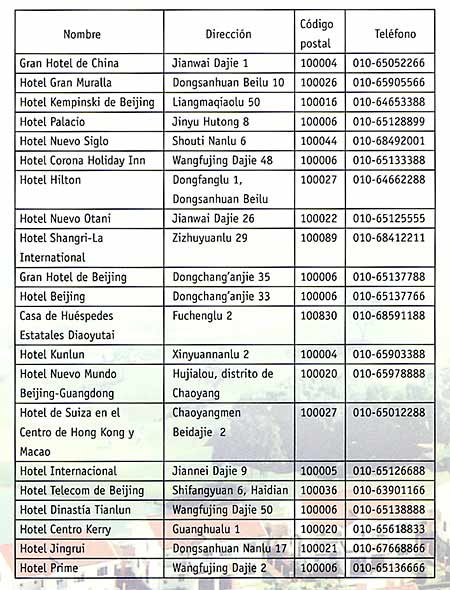 En la actualidad, funcionan más de 7.300 hoteles con estrellas. En todas las zonas de interés turístico de categoría nacional hay hoteles de tres o más estrellas. En la capital, Beijing, 508 hoteles con estrellas prestan servicios satisfactorios. Los siguientes son principales de Beijing, con cinco estrellas.
