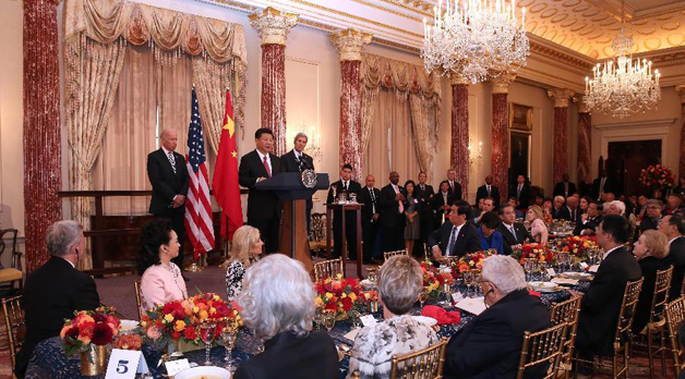 Chinese President Xi Jinping (2nd L, Rear) attends a luncheon hosted by U.S. Vice President Joe Biden (1st L, Rear) and Secretary of State John Kerry (3rd L, Rear) at the State Department in Washington D.C., the United States, Sept. 25, 2015. (Xinhua/Pang Xinglei) |
