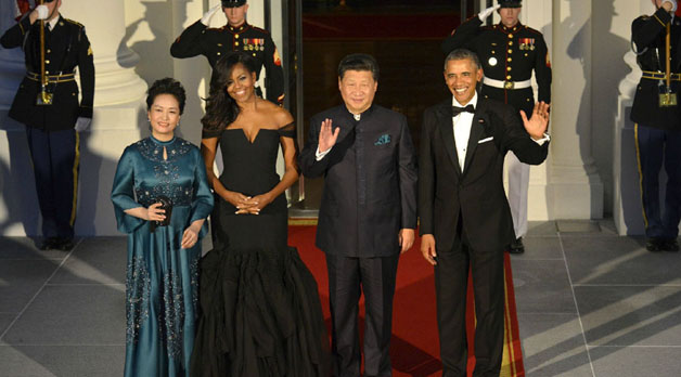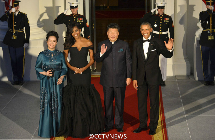 US President Barack Obama (R) and First Lady Michelle Obama (2nd from left) pose with Chinese President Xi Jinping (2nd from right) and his wife Peng Liyuan as they arrive for a state dinner at the White House in Washington, Sept 25, 2015.[Photo:Weibo.com/CCTVNEWS] |