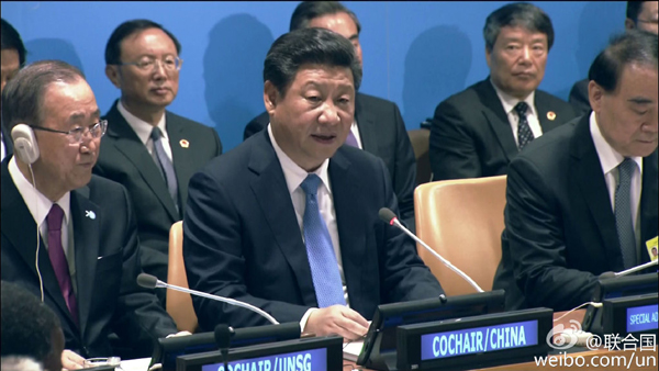 Chinese President Xi Jinping speaks at the South-South cooperation roundtable?on Saturday. [Photo / UN ] |